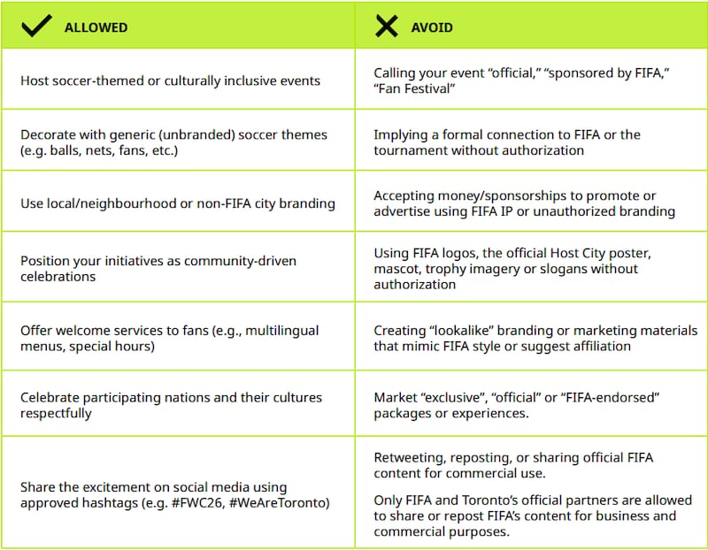 Unless a business or organization is legally permitted to use FIFA’s intellectual property—meaning if they are an official partner, host city stake holder or sponsor, for example—they are otherwise not allowed to use official tournament logos (including the trophy symbol and Host City logo), branded visuals, phrases and terms (like FIFA, World Cup, FIFA World Cup 26 and FIFA World Cup 26 Toronto), as well as slogans, like “We Are Toronto” and “We Are 26.”