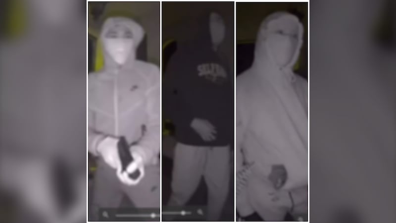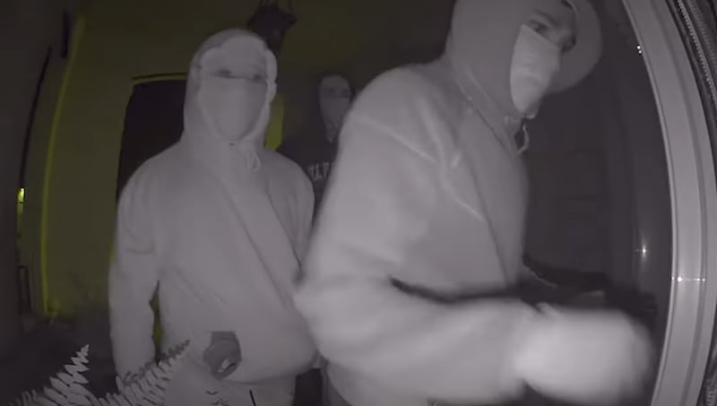 The video then appears to show one of the suspects holding a handgun and using the butt of that weapon to strike a small window around the home’s front door. He eventually succeeds in breaking the glass and is seen reaching inside to unlock it.