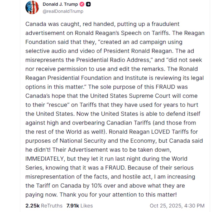 The ad features footage of former president Ronald Reagan warning about the economically devastating effects of tariffs. lt was shown again during the broadcast of the World Series on Friday night where the Toronto Blue Jays defeated the Los Angeles Dodgers.
