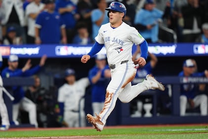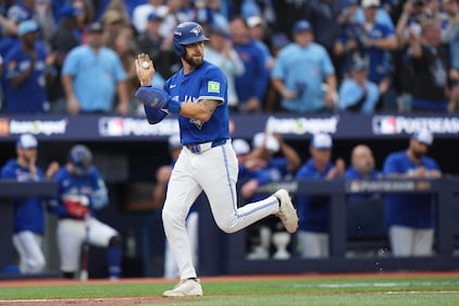 Varsho comes in to score Toronto Blue Jays' Daulton Varsho (5) runs home to score against the Seattle Mariners during second inning MLB American League Championship Series game 6 baseball action in Toronto, Sunday, Oct. 19, 2025. (Frank Gunn/THE CANADIAN PRESS)