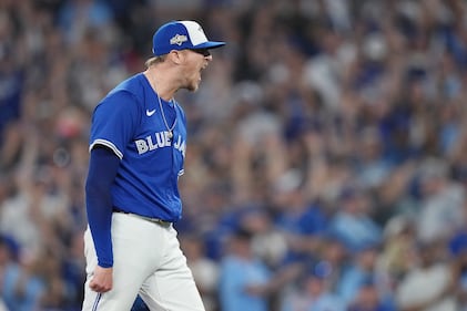 Fluharty contributes in bullpen game Toronto Blue Jays pitcher Mason Fluharty hands the ball to manager John Schneider as he leaves the game after giving up a solo home run to New York Yankees Ryan McMahon during the third inning of Game 4 of baseball's American League Division Series, Wednesday, Oct. 8, 2025, in New York. (Yuki Iwamura/AP)