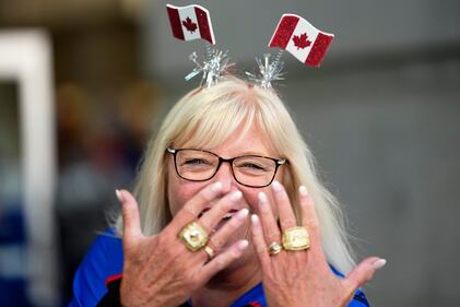 Blue Jays fans excited ahead of ALCS Game 1 Jonie Boccia shows Toronto Blue Jays World Series replica rings outside the stadium prior to Game 1 of baseball's American League Championship Series against the Seattle Mariners, Sunday, Oct. 12, 2025, in Toronto. (David J. Phillip/AP)