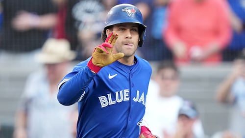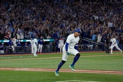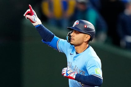 George Springer hits a solo 'dinger' Toronto Blue Jays right fielder George Springer (4) rounds the bases after hitting a solo home run against the Seattle Mariners during first inning American League Championship Series baseball action in Toronto on Sunday, Oct. 12, 2025. (Nathan Denette/THE CANADIAN PRESS)