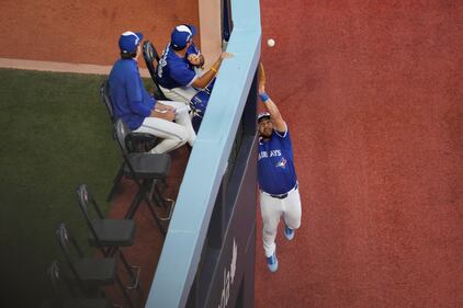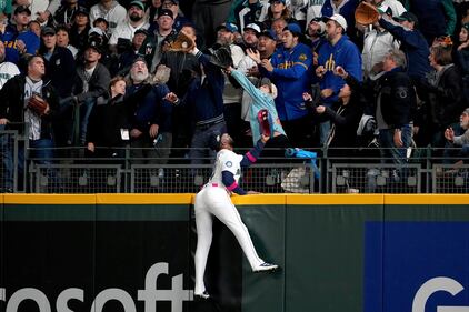 Kirk hits a three-run homer in Game 3 Fans catch a three run home run ball hit by Toronto Blue Jays' Alejandro Kirk as Seattle Mariners' Victor Robles hangs on the wall during the sixth inning in Game 3 of baseball's American League Championship Series, Wednesday, Oct. 15, 2025, in Seattle. (AP Photo/Lindsey Wasson) (AP)