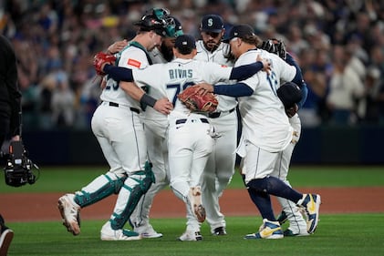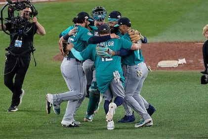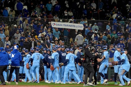 Mariners celebrate winning Game 1 The Seattle Mariners celebrate after Game 1 of baseball's American League Championship Series against the Toronto Blue Jays, Sunday, Oct. 12, 2025, in Toronto. (David J. Phillip/AP)
