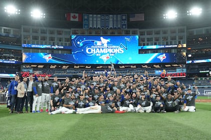 The ALCS champions The Toronto Blue Jays pose for a team photo as they celebrate after defeating the Seattle Mariners in MLB American League Championship Series game 7 baseball action in Toronto, Monday, Oct. 20, 2025. THE CANADIAN PRESS/Nathan Denette (Nathan Denette/THE CANADIAN PRESS)