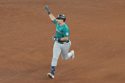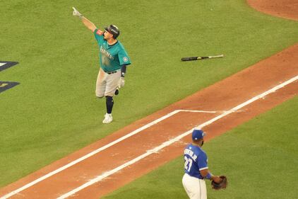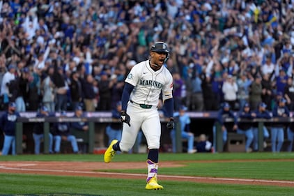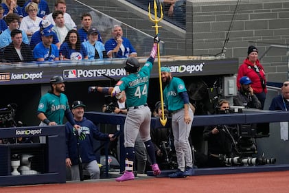 Julio Rodríguez's three-run homer Seattle Mariners' Julio Rodríguez celebrates with the trident after hitting a three-run home against the Toronto Blue Jays during the first inning in Game 2 of baseball's American League Championship Series, Monday, Oct. 13, 2025, in Toronto. (AP Photo/David J. Phillip) (AP)