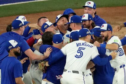 Blue Jays players celebrate on the field The Toronto Blue Jays celebrate after Game 7 of baseball's American League Championship Series against the Seattle Mariners, Monday, Oct. 20, 2025, in Toronto. (David J. Phillip/AP)