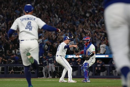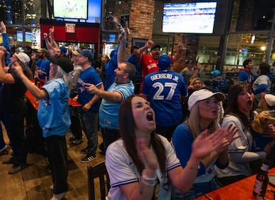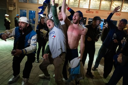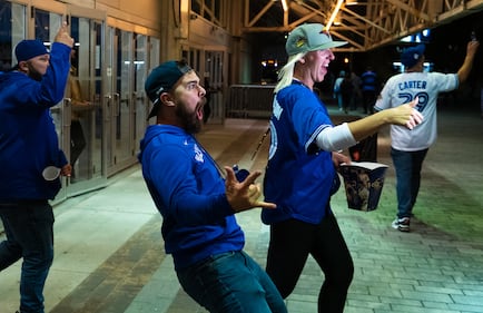 Blue Jays fans go wild after Springer's homer Toronto Blue Jays fans react after the team scored against the Seattle Mariners to win the American League Championship Series, in Toronto, Monday, Oct. 20, 2025. (Laura Proctor/The Canadian Press)