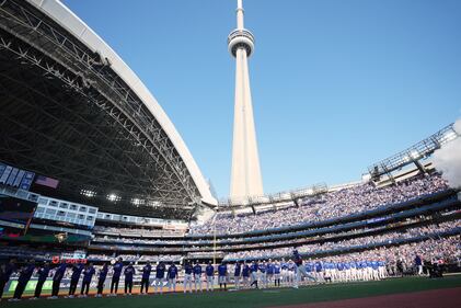 Blue Jays vs Yankees. The Canadian flag is displayed on the field during an anthems ceremony ahead of the start of the American League Division Series MLB playoff series between the Toronto Blue Jays and the New York Yankees in Toronto on Saturday, October 4, 2025. THE CANADIAN PRESS/Chris Young