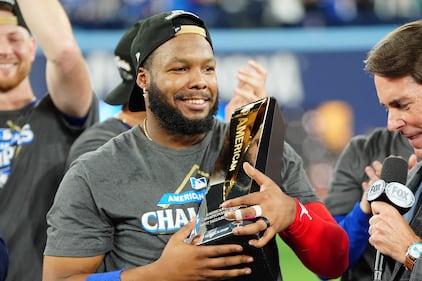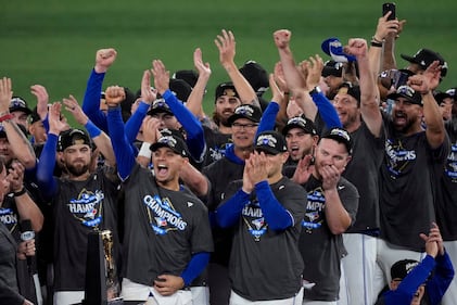 Hoisting the ALCS trophy Toronto Blue Jays outfielder George Springer holds the American League Championship Series trophy as the Blue Jays celebrate after defeating the Seattle Mariners in MLB American League Championship Series game 7 baseball action in Toronto, Monday, Oct. 20, 2025. (Frank Gunn/THE CANADIAN PRESS)