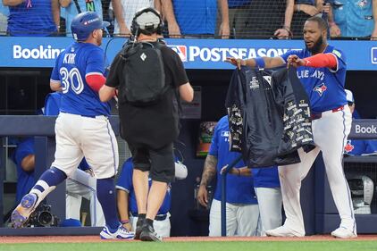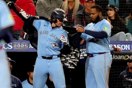 Springer's home run Toronto Blue Jays George Springer, left puts on the post season celebratory jacket after his home run during the fourth inning in Game 3 of baseball's American League Championship Series, Wednesday, Oct. 15, 2025, in Seattle. (AP Photo/Lindsey Wasson) (AP)