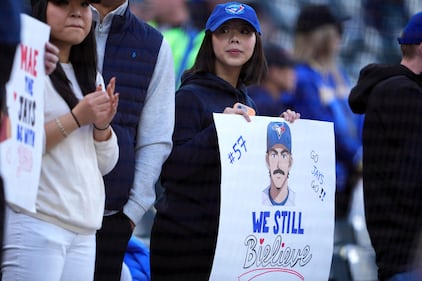 Toronto Blue Jays A Toronto Blue Jays fan holds up a sign ahead of the start of the American League Division Series MLB playoff series between the Toronto Blue Jays and the New York Yankees in Toronto on Saturday, October 4, 2025. THE CANADIAN PRESS/Frank Gunn