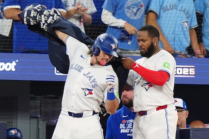 Toronto Blue Jays' Vladimir Guerrero Jr. Toronto Blue Jays' Vladimir Guerrero Jr. (27) celebrates with Addison Barger (47) after hitting a home run during the first inning of game 1 in MLB American League Division Series baseball action against the New York Yankees in Toronto on Saturday, October 4, 2025. THE CANADIAN PRESS/Frank Gunn/Frank Gunn