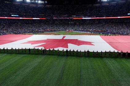 Canadian flag on the field for national anthem The Canadian flag is displayed on the field prior to Game 1 of baseball's American League Championship Series between the Toronto Blue Jays and the Seattle Mariners, Sunday, Oct. 12, 2025, in Toronto. (David J. Phillip/AP)