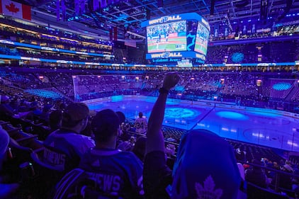 Maple Leafs fans watch from Scotiabank Arena Toronto Maple Leafs fans cheer for the Toronto Blue Jays as the ALCS game against the Seattle Mariners is displayed on the video board at Scotiabank Arena after an NHL Hockey game between the Toronto Maple Leafs and the Detroit Red Wings in Toronto, on Monday, Oct. 13, 2025. (Sammy Kogan/The Canadian Press)