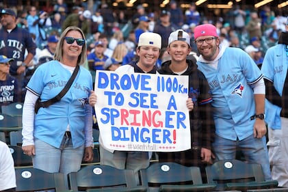Jays fans make the trek Toronto Blue Jays fans pose for a photo as they wait for game 3 American League Championship Series baseball action between the Seattle Mariners and the Toronto Blue Jays in Seattle on Wednesday, Oct. 15, 2025. THE CANADIAN PRESS/Frank Gunn (THE CANADIAN PRESS)
