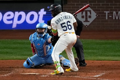 Arozarena gets hit by a pitch Seattle Mariners' Randy Arozarena is hit by a pitch during the eighth inning in Game 5 of baseball's American League Championship Series against the Toronto Blue Jays, Friday, Oct. 17, 2025, in Seattle. (David J. Phillip/AP)
