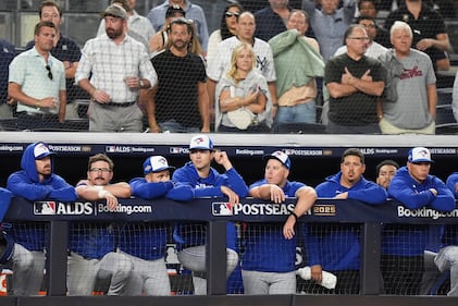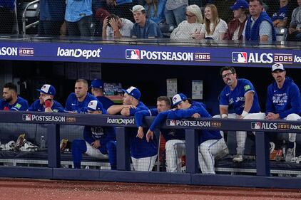 Blue Jays players looking dejected The Toronto Blue Jays watch from the dugout during the ninth inning in Game 1 of baseball's American League Championship Series against the Seattle Mariners, Sunday, Oct. 12, 2025, in Toronto. (David J. Phillip/AP)