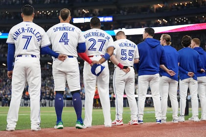 Blue Jays ready to play ALCS Game 7 Toronto Blue Jays' Isiah Kiner-Falefa (7), George Springer (4), Vladimir Guerrero Jr. (27), Tyler Heineman (55) and members of the bullpen line up for the singing of the national anthems ahead of first inning MLB American League Championship Series game 7 baseball action against the Seattle Mariners in Toronto, Monday, Oct. 20, 2025. (Nathan Denette/THE CANADIAN PRESS)
