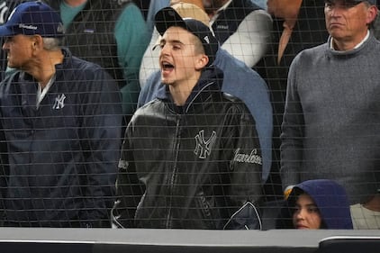 Timothee Chalamet and Kylie Jenner watch on Timothee Chalamet, center, reacts while watching Game 4 of baseball's American League Division Series between the New York Yankees and the Toronto Blue Jays, Wednesday, Oct. 8, 2025, in New York. (Yuki Iwamura/AP)