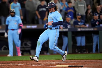 Barger scores on the Springer double Toronto Blue Jays' Addison Barger scores on an double hit by George Springer during the fifth inning in Game 5 of baseball's American League Championship Series against the Seattle Mariners, Friday, Oct. 17, 2025, in Seattle. (Lindsey Wasson/AP)