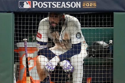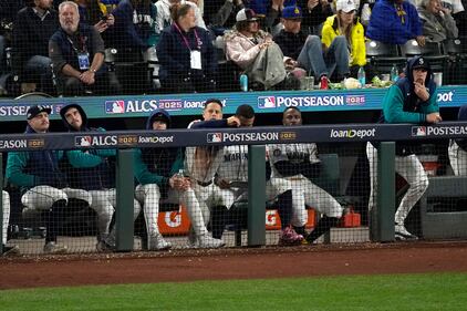 Mariners turn to look dejected from the dugout Seattle Mariners players watch from the dugout during the ninth inning in Game 4 of baseball's American League Championship Series against the Toronto Blue Jays, Thursday, Oct. 16, 2025, in Seattle. (David J. Phillip/AP)