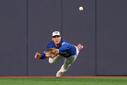 Blue Jays vs Yankees Toronto Blue Jays centre fielder Daulton Varsho (5) makes a catch against the New York Yankees during the eighth inning of game 1 in MLB American League Division Series baseball action in Toronto on Saturday, October 4, 2025. THE CANADIAN PRESS/Nathan Denette