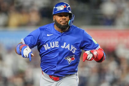 Blue Jays Toronto Blue Jays first baseman Vladimir Guerrero Jr. (27) runs onto the field as he's introduced ahead of the start of the American League Division Series MLB playoff series between the Toronto Blue Jays and the New York Yankees in Toronto on Saturday, October 4, 2025. THE CANADIAN PRESS/Nathan Denette