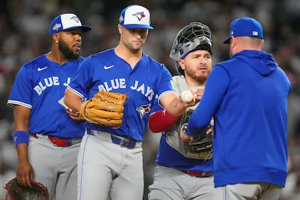 ALDS Blue Jays Yankees Baseball Toronto Blue Jays pitcher Brendon Little hands the ball to manager John Schneider as he leaves the game against the New York Yankees during the sixth inning of Game 3 of baseball's American League Division Series, Tuesday, Oct. 7, 2025, in New York. (AP Photo/Yuki Iwamura) (Yuki Iwamura/AP)
