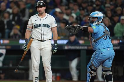 Raleigh strikes out looking Seattle Mariners' Cal Raleigh, left, strikes out looking during the third inning in Game 4 of baseball's American League Championship Series as Toronto Blue Jays' Alejandro Kirk looks towards third base, Thursday, Oct. 16, 2025, in Seattle. (Abbie Parr/AP)