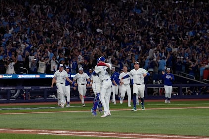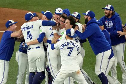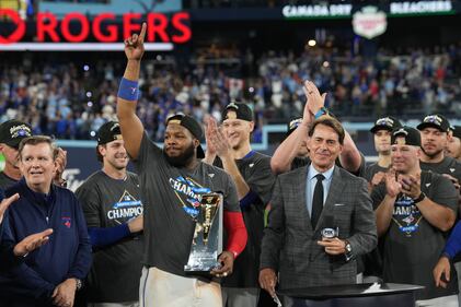 Blue Jays win the American League pennant The Toronto Blue Jays celebrate after Game 7 of baseball's American League Championship Series against the Seattle Mariners, Monday, Oct. 20, 2025, in Toronto. (David J. Phillip/AP)