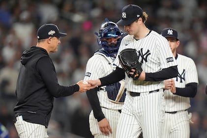 Schlittler goes 6 1/3 for Yanks New York Yankees pitcher Cam Schlittler hands the ball to manager Aaron Boone as he leaves the game during the seventh inning of Game 4 of baseball's American League Division Series against the Toronto Blue Jays, Wednesday, Oct. 8, 2025, in New York. (Frank Franklin II/AP)