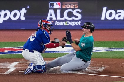 Kirk tags out Raleigh at home Seattle Mariners' Cal Raleigh (right), is tagged out at the plate by Toronto Blue Jays catcher Alejandro Kirk on a fielder's choice hit by Jorge Polanco during the first inning in Game 1 of baseball's American League Championship Series, Sunday, Oct. 12, 2025, in Toronto. (David J. Phillip/AP)