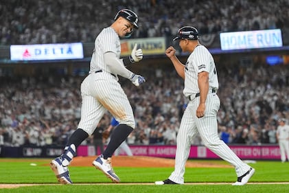 Aaron Judge celebrates after hitting three-run home run New York Yankees' Aaron Judge celebrates with third base coach Luis Rojas after hitting a three-run home run against the Toronto Blue Jays during the fourth inning of Game 3 of baseball's American League Division Series, Tuesday, Oct. 7, 2025, in New York. (AP Photo/Yuki Iwamura)