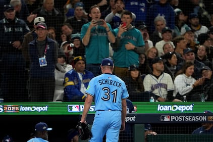 Scherzer ends his rowdy night Toronto Blue Jays pitcher Max Scherzer leaves the game during the sixth inning in Game 4 of baseball's American League Championship Series against the Seattle Mariners, Thursday, Oct. 16, 2025, in Seattle. (Lindsey Wasson/AP)