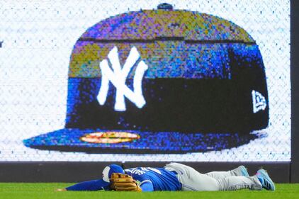 Santander lays on the field after missing a catch Toronto Blue Jays right fielder Anthony Santander (25) lays in the grass after missing a catch on a double hit by New York Yankees' Cody Bellinger during the sixth inning of Game 3 of baseball's American League Division Series, Tuesday, Oct. 7, 2025, in New York. (AP Photo/Yuki Iwamura)