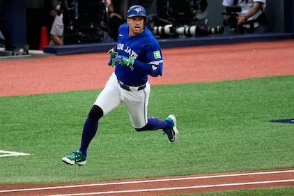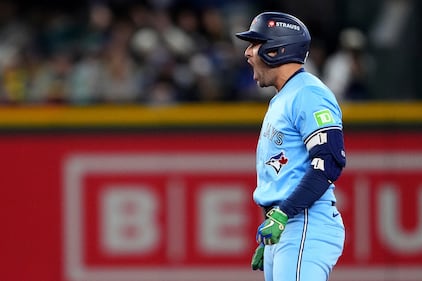 Springer runs out a double Toronto Blue Jays' George Springer runs out a double during the first inning in Game 2 of baseball's American League Championship Series against the Seattle Mariners, Monday, Oct. 13, 2025, in Toronto. (AP Photo/David J. Phillip) (AP)