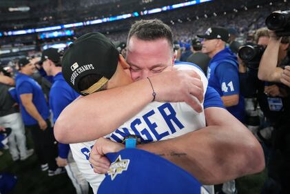 Hugs for everyone on the field Toronto Blue Jays manager John Schneider, right, hugs George Springer as they celebrate after defeating the Seattle Mariners in MLB American League Championship Series game 7 baseball action in Toronto, Monday, Oct. 20, 2025. (Nathan Denette/THE CANADIAN PRESS)