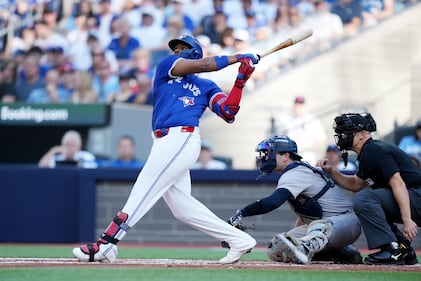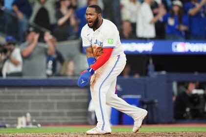 Blue Jays first baseman Vladimir Guerrero Jr. flips his bat after hitting a grand slam in the fourth inning of MLB American League Division Series action against the New York Yankees in Toronto on Oct. 5, 2025. THE CANADIAN PRESS/Nathan Denette Blue Jays first baseman Vladimir Guerrero Jr. flips his bat after hitting a grand slam in the fourth inning of MLB American League Division Series action against the New York Yankees in Toronto on Oct. 5, 2025. THE CANADIAN PRESS/Nathan Denette