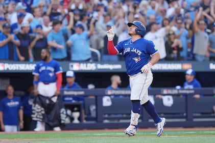 Alejandro Kirk Toronto Blue Jays' Alejandro Kirk (30) celebrates his solo home run during the second inning of game 1 in MLB American League Division Series baseball action against the New York Yankees in Toronto on Saturday, October 4, 2025. THE CANADIAN PRESS/Frank Gunn (Frank Gunn/The Canadian Press)