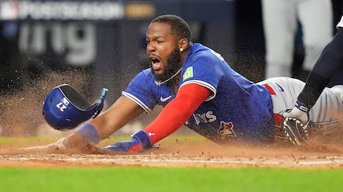 Vladimir Guerrero Jr. Toronto Blue Jays Vladimir Guerrero Jr. dives into home plate to score against the New York Yankees during the third inning of Game 3 of baseball's American League Division Series, Tuesday, Oct. 7, 2025, in New York. (AP Photo/Frank Franklin II) (Frank Franklin II/AP)