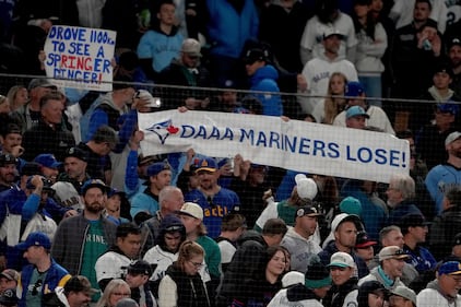 Jays beat Mariners 13-4 Toronto Blue Jays fans hold signs during the eighth inning in Game 3 of baseball's American League Championship Series against the Seattle Mariners, Wednesday, Oct. 15, 2025, in Seattle. (AP Photo/Lindsey Wasson) (AP)
