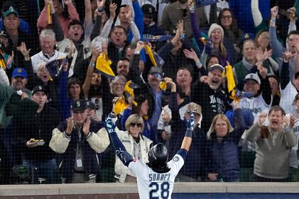 Suárez gets Mariners on the board first Seattle Mariners' Eugenio Suárez celebrates his solo home run against the Toronto Blue Jays during the second inning in Game 5 of baseball's American League Championship Series, Friday, Oct. 17, 2025, in Seattle. (David J. Phillip/AP)