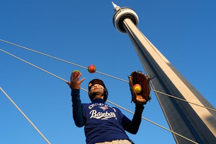 Toronto gears up for Game 1 Cesar Agular tosses a baseball outside the stadium prior to Game 1 of baseball's American League Championship Series between the Toronto Blue Jays and the Seattle Mariners, Sunday, Oct. 12, 2025, in Toronto. (AP Photo/David J. Phillip) (AP)