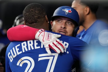 Blue Jays vs Yankees Blue Jays catcher Alejandro Kirk hugs teammate Vladimir Guerrero Jr. after hitting a home run against the New York Yankees during the eighth inning of Game 1 in MLB American League Division Series action in Toronto on Oct. 4, 2025. THE CANADIAN PRESS/Nathan Denette