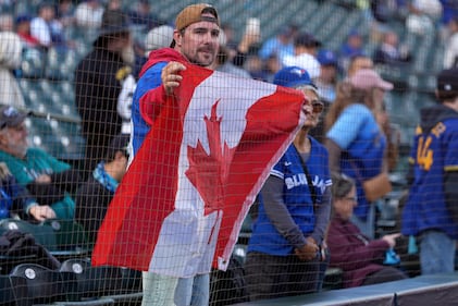 More Canadian fans attend Game 4 in Seattle Toronto Blue Jays fans wearing Canadian flags look on from the stands prior to first inning MLB American League Championship Series game 4 baseball action between the Seattle Mariners and the Toronto Blue Jays, in Seattle, Thursday, Oct. 16, 2025. (Frank Gunn/THE CANADIAN PRESS)