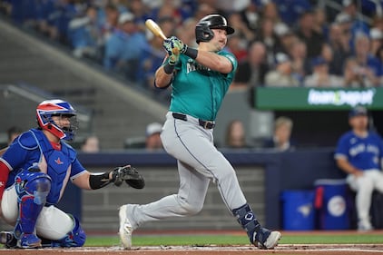 Cal Raleigh's first at bat Seattle Mariners' Cal Raleigh (29) hits a single against the Blue Jays during first inning American League Championship Series baseball action in Toronto on Sunday, Oct. 12, 2025. THE CANADIAN PRESS/Frank Gunn