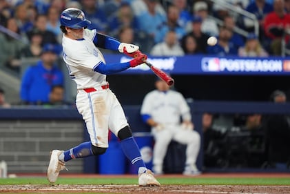 Barger hits big homer Toronto Blue Jays' Addison Barger (47) celebrates with Vladimir Guerrero Jr. after hitting a two-run home run against the Seattle Mariners during third inning MLB American League Championship Series game 6 baseball action in Toronto, Sunday, Oct. 19, 2025. (Frank Gunn/THE CANADIAN PRESS)