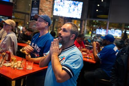 Blue Jays fans watch on nervously Toronto Blue Jays fans watch the team play against the Seattle Mariners for the American League Championship Series at the Rogers Centre in Toronto, Monday, Oct. 20, 2025. THE CANADIAN PRESS/Laura Proctor (Laura Proctor/The Canadian Press)